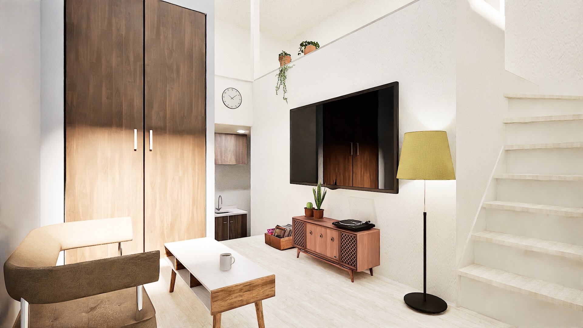 ダイニングスペースから階段を上がると、寝室として使えるロフトスペースが広がります。衣類収納や室内物干しを配置した+αの空間も設け、入居者様に快適な暮らしをイメージさせます。